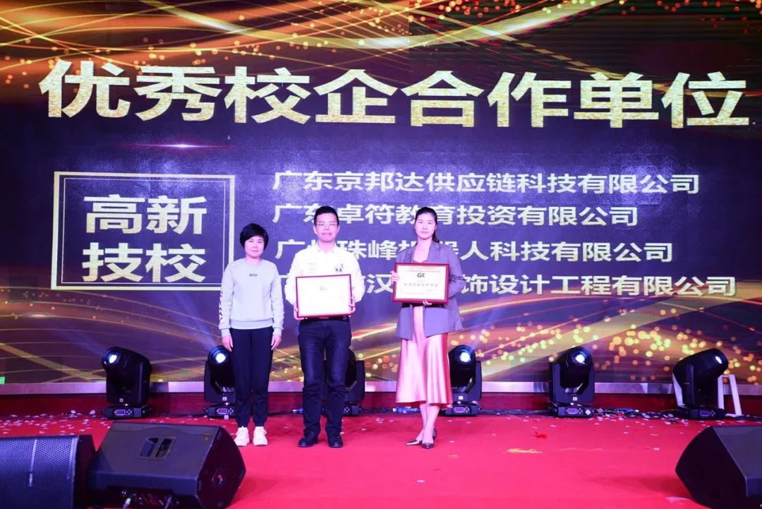 同時,活動現場為廣東省高新技術高級技工學校的校企合作單位:廣東京邦達供應鏈科技有限公司、廣東卓符教育投資有限公司、廣州珠峰機器人科技有限公司、廣州市漢典裝飾設計工程有限公司;廣州市高新醫藥與食品技工學校的校企合作單位:廣州建國酒店、大參林醫藥集團股份有限公司、佛山市三水區西南街金百合美容中心進行了優秀校企合作單位的表彰。