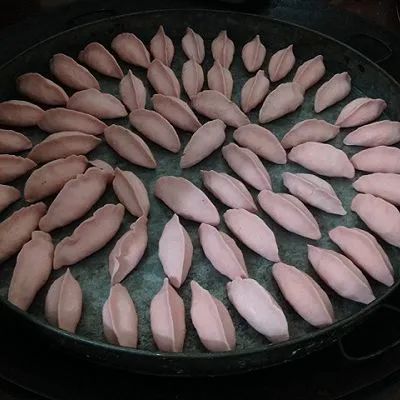重點說說我愛吃的芋頭餃吧,把它含在嘴里時滑溜溜的,如同泥鰍。選用粉粉軟糯、有粘性的芋頭,和番薯粉一起揉成面團,然后再包肉餡。煮好的芋餃吃起來既糯又柔,滑溜可口。