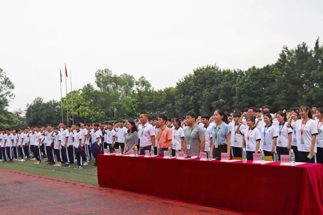 廣東省高新技術高級技工學校新團員入團宣誓儀式暨優秀團組織表彰大會于2019年5月27日16:10在西區足球場隆重舉行。參加本次大會的領導有:文建友副校長、學生處曾成處長、學生處陳偉副處長、團委書記劉榮榮、汽車工程系鄭大國主任、藝術與計算機系王慶有副主任、經貿系姚幸連副主任。參加大會的還有在校1833名團員。