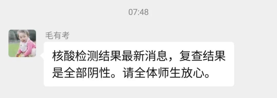 在上級部門的關(guān)懷和支持下,10月16日下午,廣東省高新技術(shù)高級技工學(xué)校進(jìn)行了全員篩查,次日清晨公布了結(jié)果:高新技校內(nèi)的全體師生、家屬、工勤人員等7383人,全部為 核酸檢測陰性!